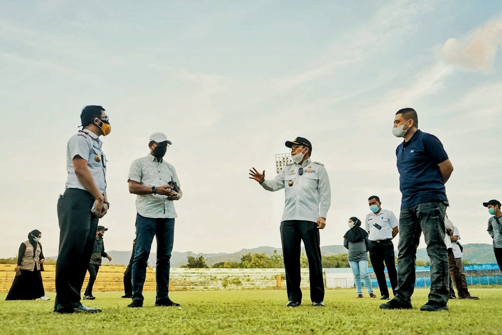 Dalam kunjungan itu, Taufan dan Appi disambut tepuk riuh sejumlah pemain sepak bola yang tengah beristirahat usai memanfaatkan lapangan dalam bermain sepak bola. “Hidup Pak Wali,” seru para pemain duduk di kursi penonton stadion.