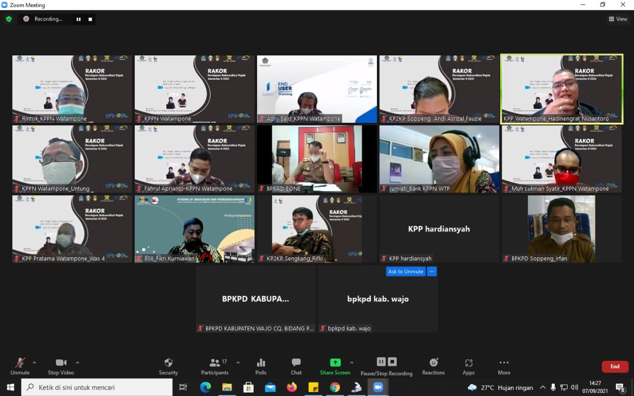 RADARBONE.ID, WATAMPONE-KPPN Watampone menggelar rapat koordinasi persiapan rekonsiliasi pajak pusat yang dipungut dan disetorkan ke Kas Negara oleh pemerintah daerah Kabupaten Bone, Soppeng, dan Wajo Semester II tahun 2021 secara daring, Selasa (07/09/2021).