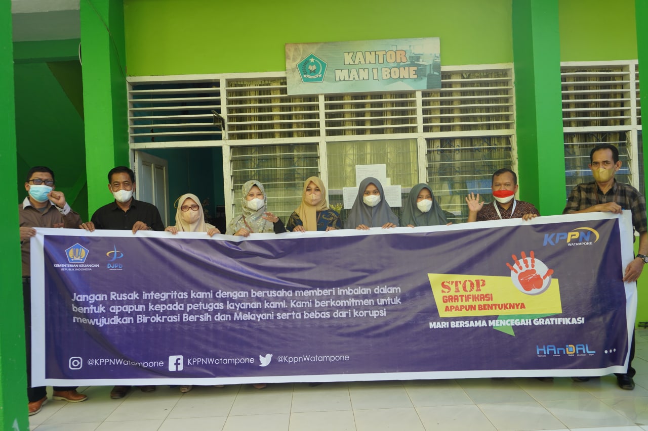 RADARBONE.ID, WATAMPONE-KPPN Watampone kembali melakukan kampanye Anti Gratifikasi. Hari ini melakukan kunjungan ke Kantor Badan Pusat Statistik (BPS) Kabupaten Bone dan Madrasah Aliyah Negeri (MAN) I Bone dengan tetap mematuhi protokol Kesehatan dalam rangka mengkampanyekan Anti Gratifikasi, Kamis (25/11/2021).