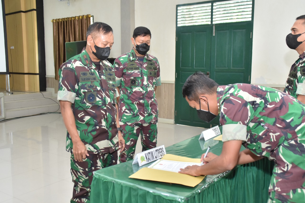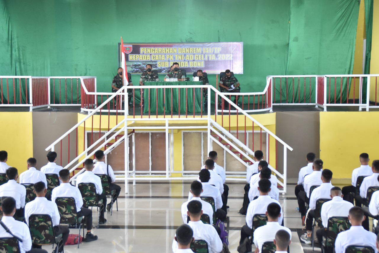 RADARBONE.ID, WATAMPONE-Jelang pelaksanaan seleksi TNI-AD tahun 2022, Korem 141/Tp mengawalinya dengan kegiatan penandatanganan Pakta Integritas oleh para panitia, Jumat, 18 Maret 2022. Penandatanganan Pakta Integritas disaksikan oleh Danrem 141/Tp Brigadir Jenderal Djashar Djamil, SE, MM, dilanjutkan dengan pengarahan diwakili Kasrem 141/Tp Kolenel Arh Elphis Rudy, SE, MM, MSc, MSS bertempat di Gedung Pemuda Kab. Bone.