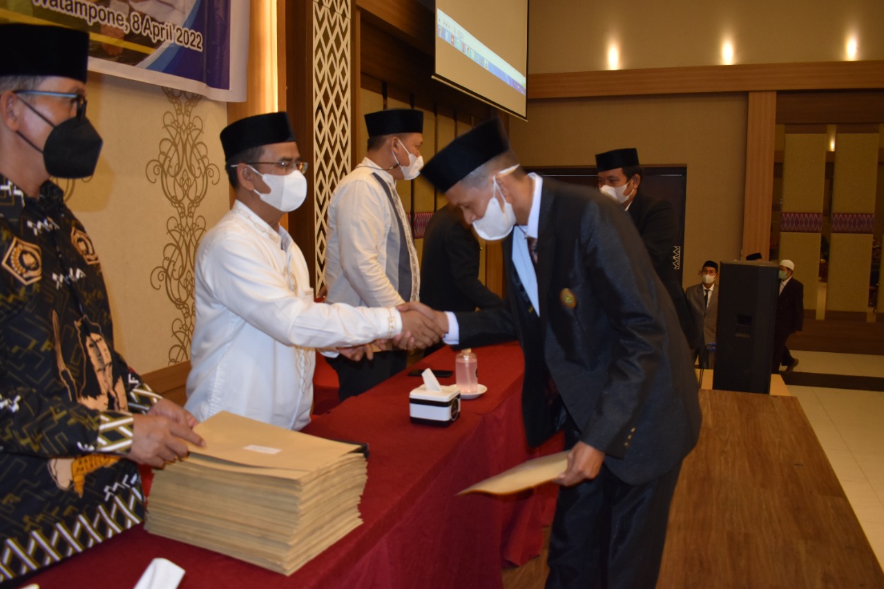 RADARBONE.ID, WATAMPONE-Sebanyak 293 guru lingkup Kementerian Agama Kabupaten Bone menerima SK pengangkatan Calon Pegawai Pemerintah dengan Perjanjian Kerja (CPPPK) tahun 2021. Penyerahan SK CPPPK dilaksanakan di Ballroom Novena Hotel Watampone, Jumat, 8 April 2022 pada 6 Ramadhan 1443 H. Penyerahan SK terkesan istimewa karena peserta CPPPK tidak seperti biasanya mengenakan hitam putih, melainkan berpakaian ala nasional, dimana laki-laki berpakaian Sipil Lengkap dan perempuan mengenakan kebaya nasional.